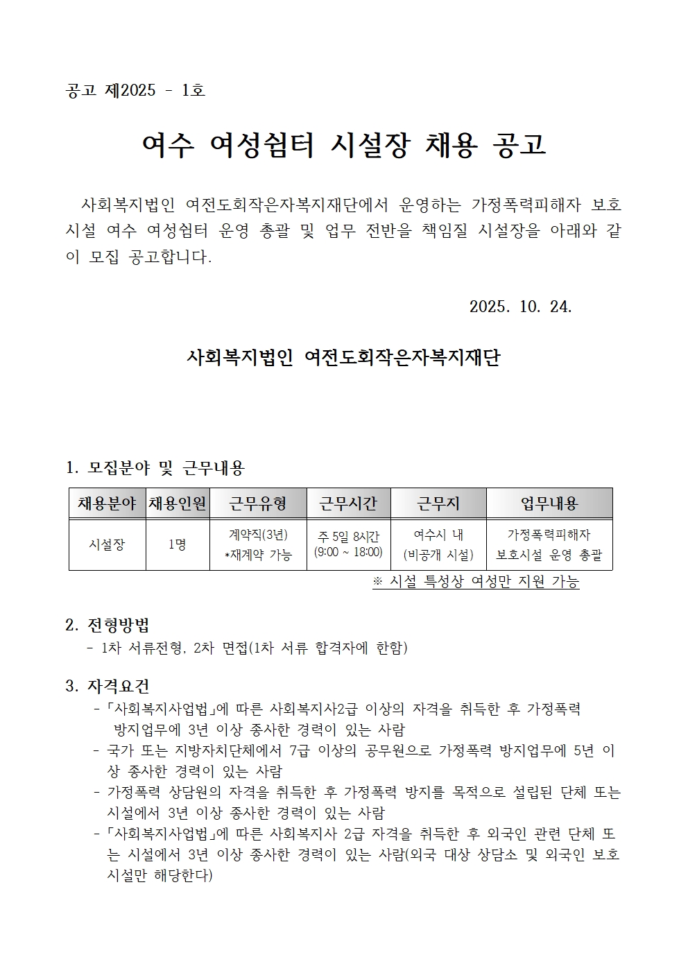 여수 여성쉼터 시설장 채용공고 안내